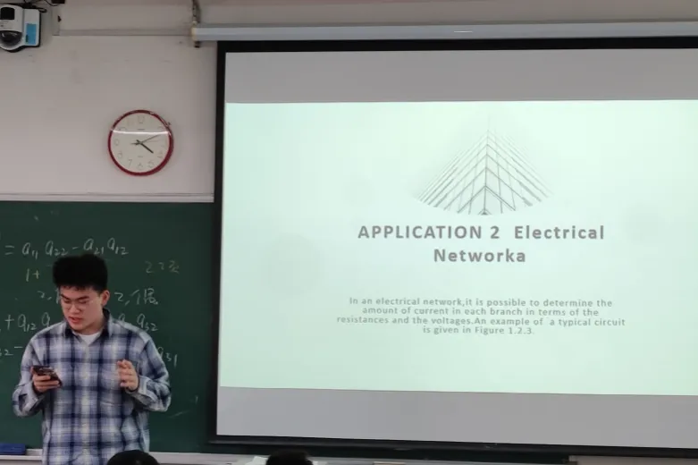 张梓瞳同学首先展示了电路在实际生活中的应用,然后利用线性方程组的求解分析了电路中的电流大小。